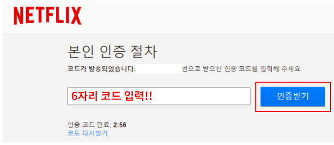 휴대폰 번호로 전송된 6자리를 입력하고 인증받기를 누르면 넷플릭스 연령 인증(성인인증 오류)을 해결할 수 있습니다.